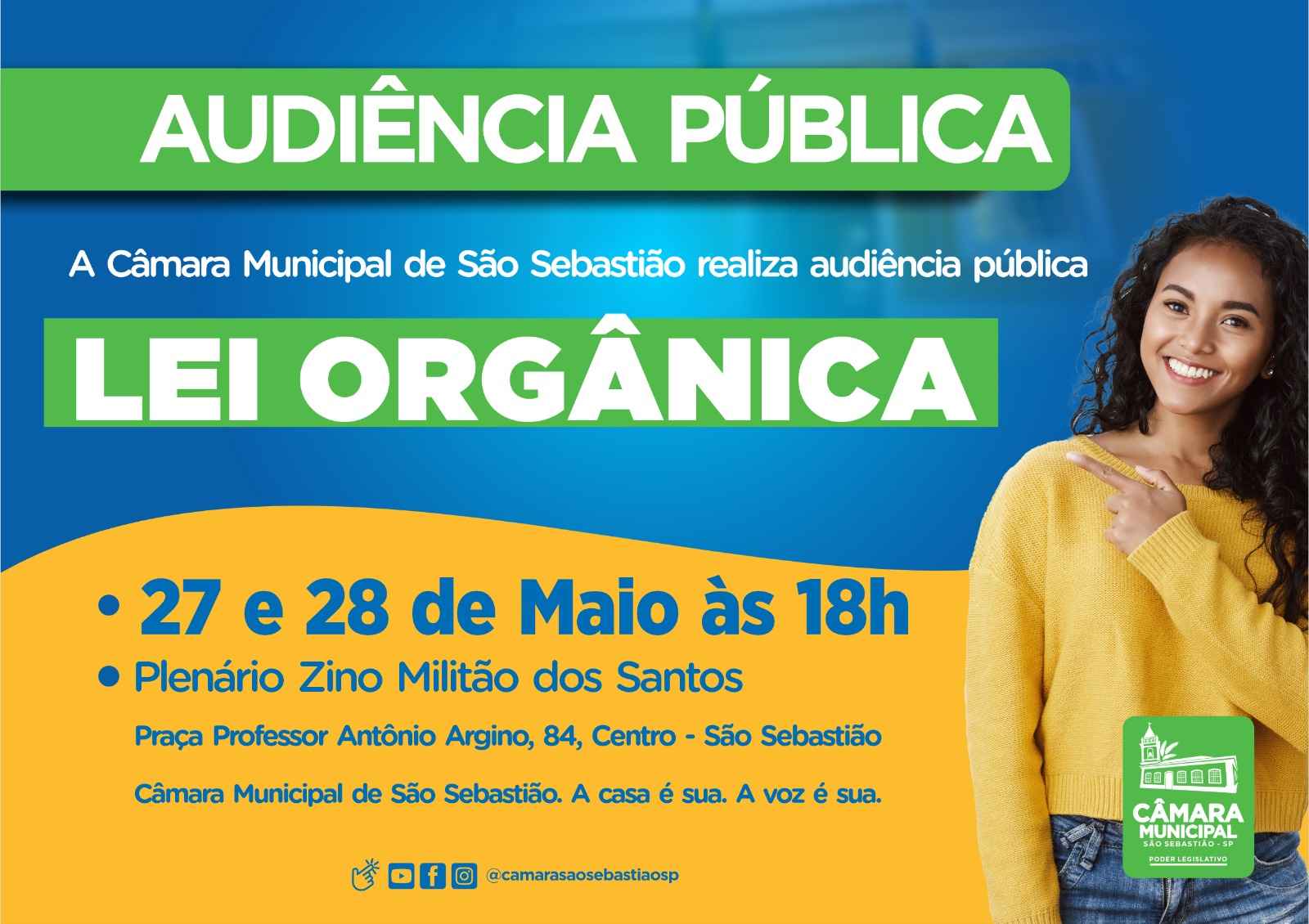 A Câmara Municipal de São Sebastião realiza, nos dias 27 e 28 de maio, às 18h, no Plenário Vereador Zino Militão dos Santos, audiência pública para discussão da Lei Orgânica do Município.